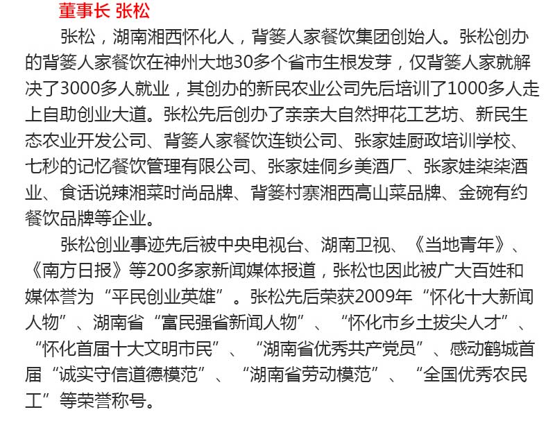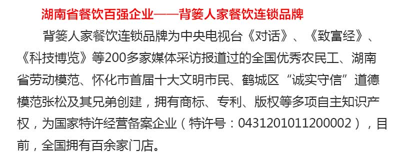 懷化市背簍人家餐飲連鎖管理有限公司為中央電視臺(tái)《對(duì)話》等200多家媒體采訪報(bào)道過(guò)的全國(guó)優(yōu)秀農(nóng)民工、湖南省勞模、鶴城區(qū)“誠(chéng)實(shí)守信”道德模范張松及其兄弟創(chuàng)建,擁有商標(biāo)、專利、版權(quán)等多項(xiàng)自主知識(shí)產(chǎn)權(quán),為國(guó)家特許經(jīng)營(yíng)備案企業(yè)(特許號(hào):0431201011200002)。
